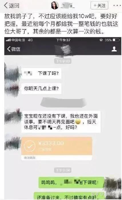 有些女大学生们说:“我父母都是农村人,每个月给我的生活费少得可怜,都不到室友的一半。可我生性好强,不想比别人差。” 你说靠自己的劳动去挣钱吧,兼职也不是没干过,饭馆子里当服务员,一天辛辛苦苦80块,名牌就别想了,地摊货倒是靠要考虑。 但是转头一想,堂堂一个女大学生,多么尊贵的身份,怎么能穿地摊货?如何搞到钱,确实伤脑筋呢。 如何实现弯道超车呢?女大学生们冥思苦想,终究不能参破这道难题。一日,表演系大三的女学生参加了一个饭局,局里的人物个个都有钱,这个女大学生隐隐约约感觉机会来了。 饭局过后,一位中年男士也不避讳,直接跟她说,要包养你。女大学生经过一番激烈的思想斗争,最终屈服了,从此财源滚滚。  都是生意,不寒碜,做的时候要有这种觉悟。一天,中年男子约女大学生,女大学生说:“你先去开房,下课我就来。” 这条信息被交往了三年的女朋友看到了,她男朋友也是果断,没办法,男朋友没钱,如何让她幸福? 这位中年男士一次比一次玩得大,一次比一次过火,女大学生逐渐感到有点力不从心了。但转念一想:“我有钱了,就可以买我想买的东西,不用再考虑,也不用心疼,更不用再节食缩衣辛辛苦苦省钱了。”茨威格说过,所有命运赠送的礼物,早已在暗中标好了价格。那天的激情过后,她在中年男士的手机里发现了惊天秘密。他们的亲密视频被传到了网上,点击量颇高。上传者正是该中年男子。不敢相信自己眼睛的女大学生拿着手机去质问他。而这个时候,男人也终于露出了自己的真面目:“你真的以为我会喜欢你吗,别做梦了,我不过是想尝一下女大学生是什么味道。”有了把柄在手,中年男子更加肆无忌惮。他威胁道:不照着我的意思办,我就把这些照片视频发给你爸妈还有同学们,自己掂量着办吧!从此,她便成为了人们的玩物。她最后染上了性病,学业也受到了影响,一个人孤苦伶仃,抬头仰望校园的天空感叹:苦读4年大学,我现在什么都没了。